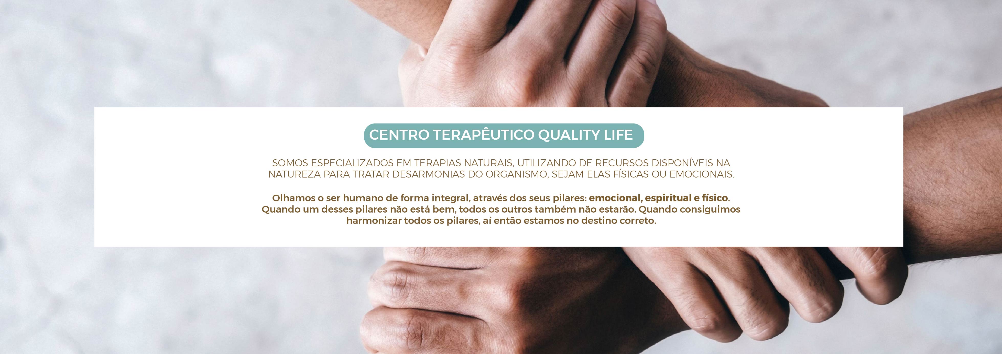 Nós somos o Centro Terapêutico Quality Life, atendemos nas cidades de Porto Alegre, Canoas e Novo Hamburgo. Somos especializados em Terapias Naturais, usando recursos naturais, disponíveis na natureza para tratar desarmonias.